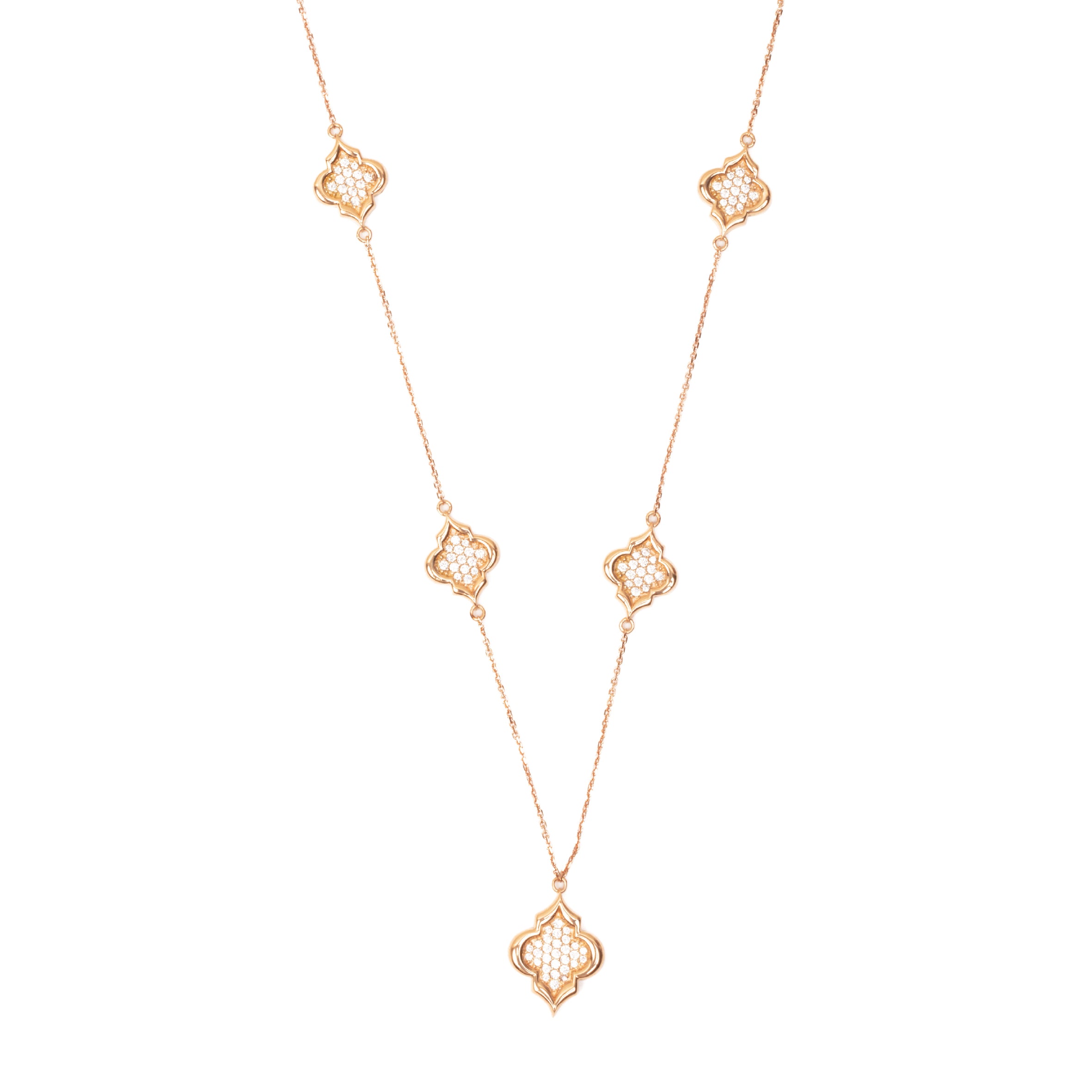 Sautoir AL HAMRA en or rose 18K, dévoile l'élégance signature de la collection à travers une succession de pendentifs finement travaillés. Sautoir inspiré des motifs marocain serti en zirconium, offrant un éclat subtil et lumineux. Un bijou à la fois moderne et empreint de tradition.