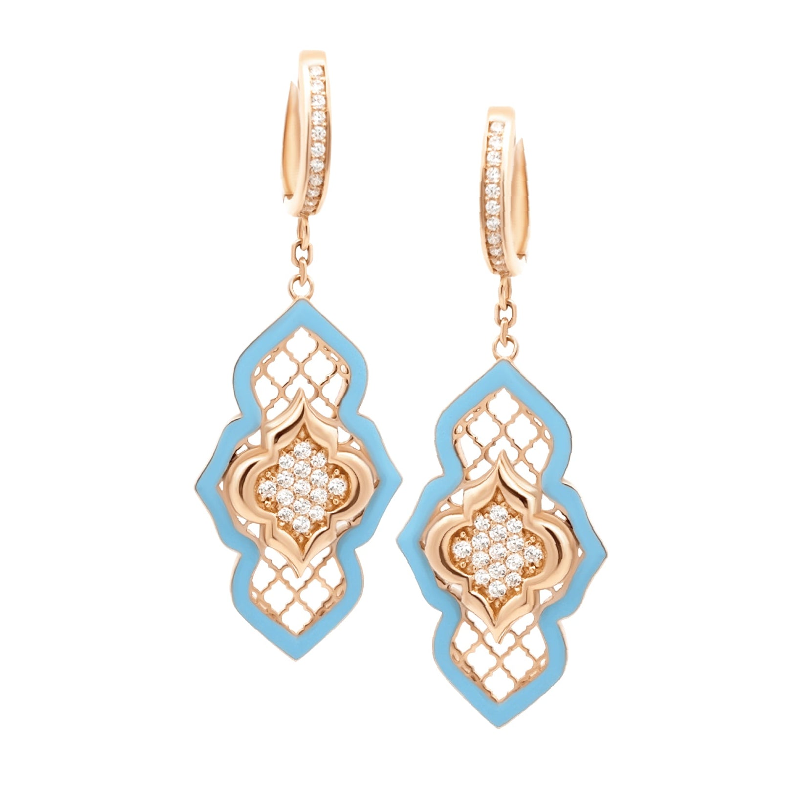 Boucles d'oreilles AL HAMRA Moucharaby en or rose 18 carats et serties de zirconium, dévoilent un design ajouré qui illumine le visage d'un éclat subtil, alliant charme oriental et modernité. Leur contour en émail bleu ciel apporte une touche de douceur et de fraîcheur, faisant de ce bijou un hommage raffiné à la féminité.