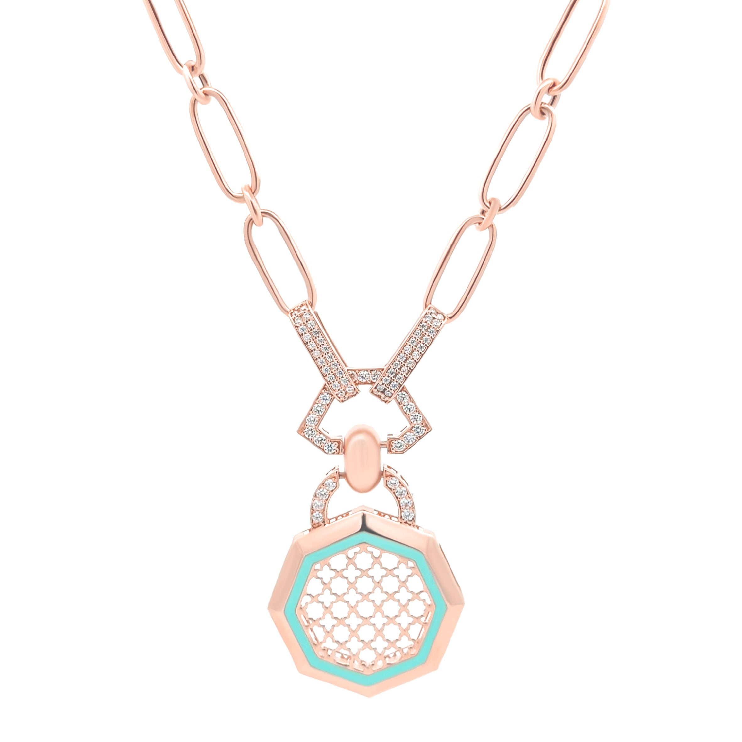 SAUTOIR HIKAYAT HARF en or rose 18K, met en lumière un pendentif octogonal finement travaillé, serti de zirconium étincelant et souligné par un contour en émail couleur vert d'eau. Le motif central rend hommage à l'art géométrique traditionnel. Un bijou lumineux, empreint de caractère et de finesse, qui reflète l'âme du patrimoine marocain.